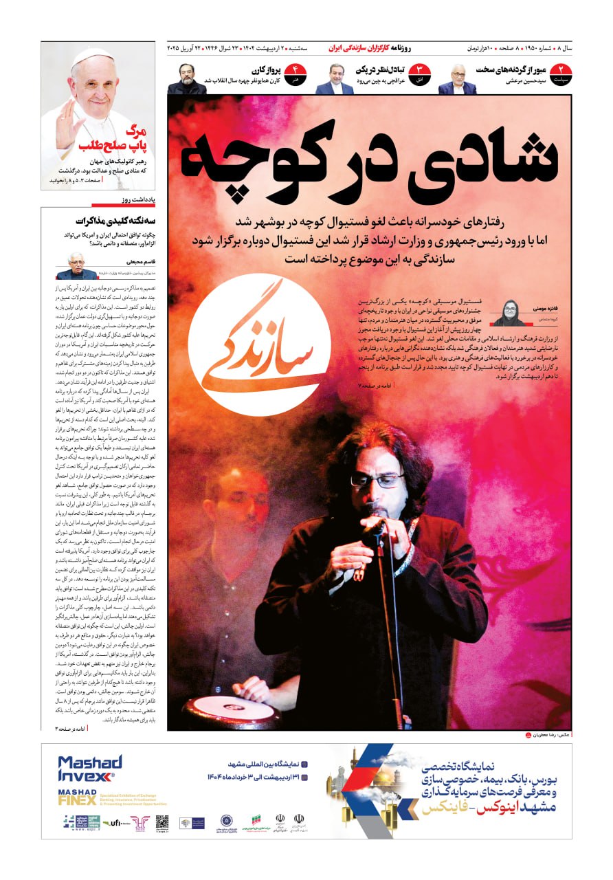 شماره ۲۱۳۴ روزنامه سازندگی چهارشنبه ۱۴۰۴/۰۹/۱۹ ۱۹-۰۹-۱۴۰۴-۲۱۳۴ Sazandegi