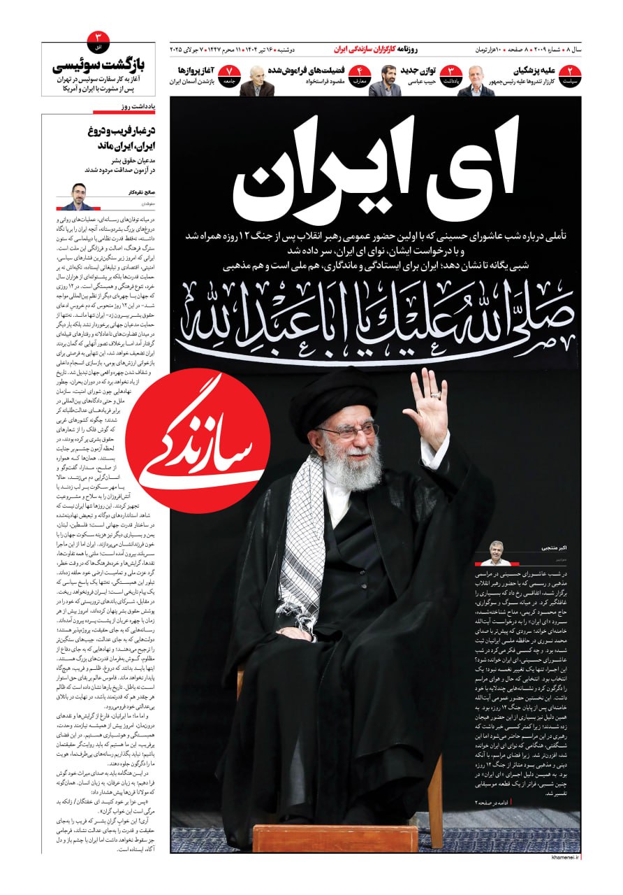 شماره ۲۱۳۴ روزنامه سازندگی چهارشنبه ۱۴۰۴/۰۹/۱۹ ۱۹-۰۹-۱۴۰۴-۲۱۳۴ Sazandegi
