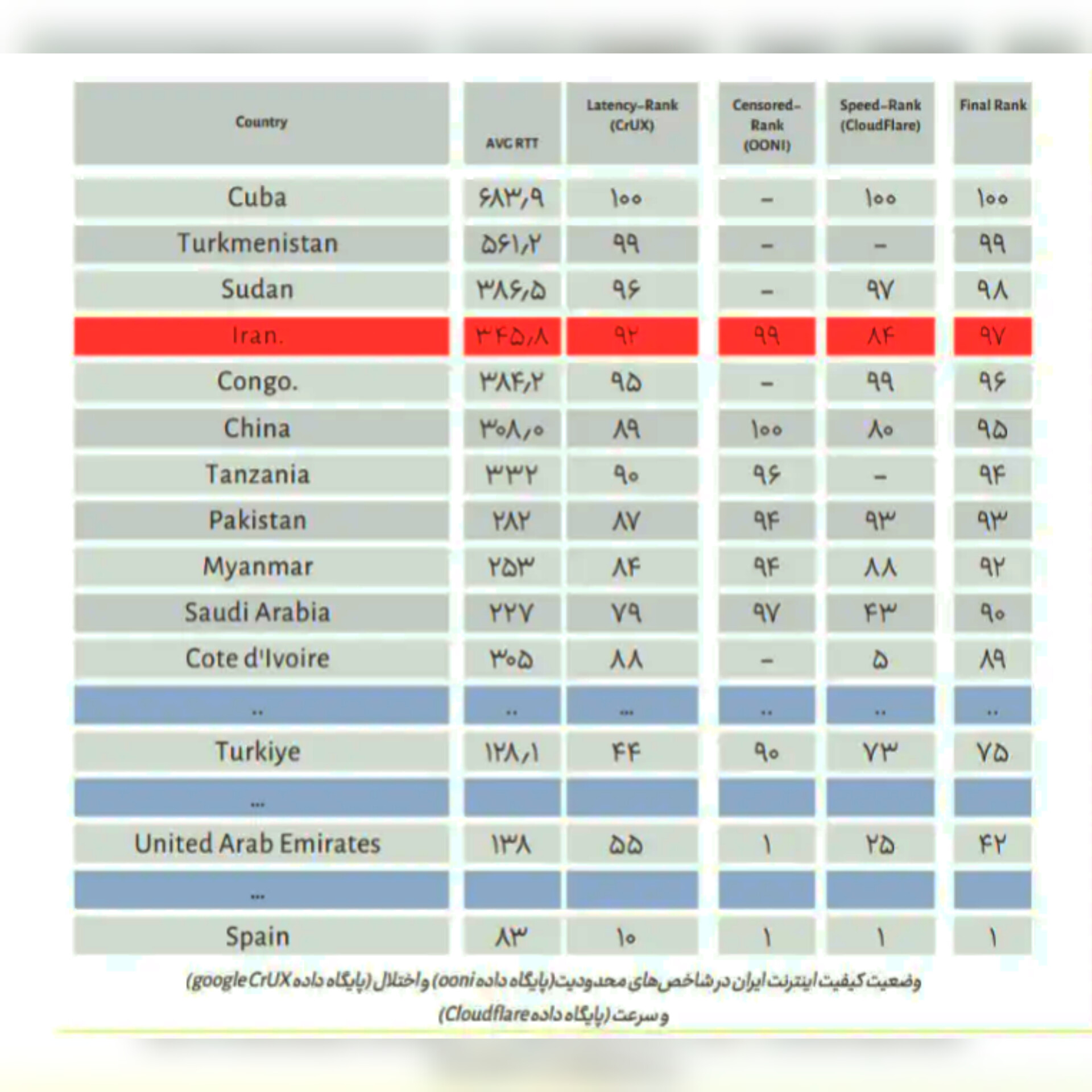 گزارش انجمن از داده‌های معتبر بین‌المللی استفاده می‌کند. شاخص تاخیر و بخشی از اختلال توسط Google CRUX شاخص سرعت با استفاده از رادار Cloudflare و شاخص محدودیت با داده‌های OONI اندازه‌گیری شده است. انتخاب این منابع امکان مقایسه ایران با کشورهای دیگر را فراهم می‌کند و نشان می‌دهد، کاهش کیفیت اینترنت بیشتر به سیاست داخلی‌ ارتباط دارد تا تحریم‌های خارجی. فیلترینگ و انسداد پروتکل‌های نوظهور مانند HTTP/3 و IPv6 باعث شده‌ است حتی پس از رفع محدودیت‌های محدود (مثلاً دسترسی دوباره به گوگل‌پلی یا واتس‌آپ) بهبود محسوسی در سرعت دیده نشود.
