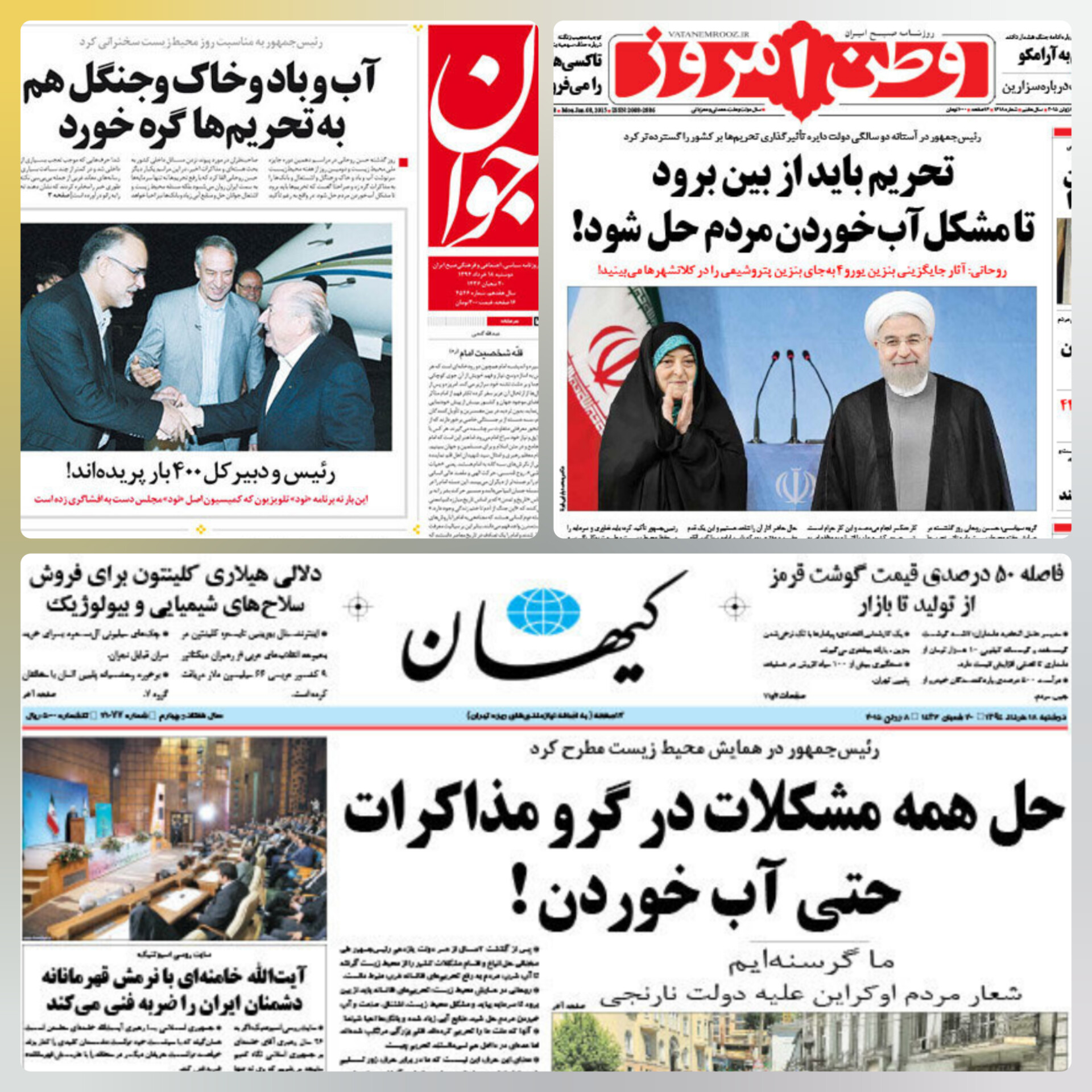 هفدهم خردادماه ۱۳۹۴ حسن روحانی در مراسم «جایزه ملی محیطزیست» تأکید کرد که تحریمهای ظالمانه باید برطرف شود تا سرمایهگذاری خارجی به کشور بازگردد، صنایع احیا شوند و مشکلاتی چون آلودگی هوا و آب شرب مردم حل شود. سخنانی که به تعبیر رسانههای آن روز، پیوند دادن همه مشکلات کشور به مذاکرات هستهای از سوی رئیسجمهور بود. روزنامههای تندرو مثل کیهان و جوان با تیترهایی مانند «حل همه مشکلات در گرو مذاکرات حتی آب خوردن!» یا «آب و باد و خاک و جنگل هم به تحریمها گره خورد» از او انتقاد کردند. روزنامه وطنامروز در گزارش یک خود به اظهارات رئیسجمهور پرداخت و نوشت: «رئیسجمهور که در هر سخنرانی، بخش زیادی از سخنان خود را به مذاکرات هستهای اختصاص میدهد این بار بازه تاثیرگذاری تحریمها را تا آب خوردن مردم بسط داد». برخی از تحلیلگران اصولگرا هم گفتند «مشکل آب ایران از سوءمدیریت و سدسازی است نه تحریم». اما گذشت زمان نشان داد، سخن روحانی نه یک شعار سیاسی بلکه توصیفی واقعبینانه از وابستگی فناوری، سرمایه و دانش زیستمحیطی ایران به ارتباطات جهانی بود و همانطور که کارشناسان سازمان ملل، سال گذشته در گزارشی تأکید کردند، تحریمها مانع نوسازی ناوگان حملونقل، واردات فناوریهای کاهش آلودگی و حتی توسعه انرژیهای تجدیدپذیر در ایران شده است. به گفته آنان، محدودیت دسترسی ایران به دانش، تجهیزات و سرمایه بینالمللی به طور مستقیم بر کیفیت محیطزیست و سلامت مردم تأثیر گذاشته است.