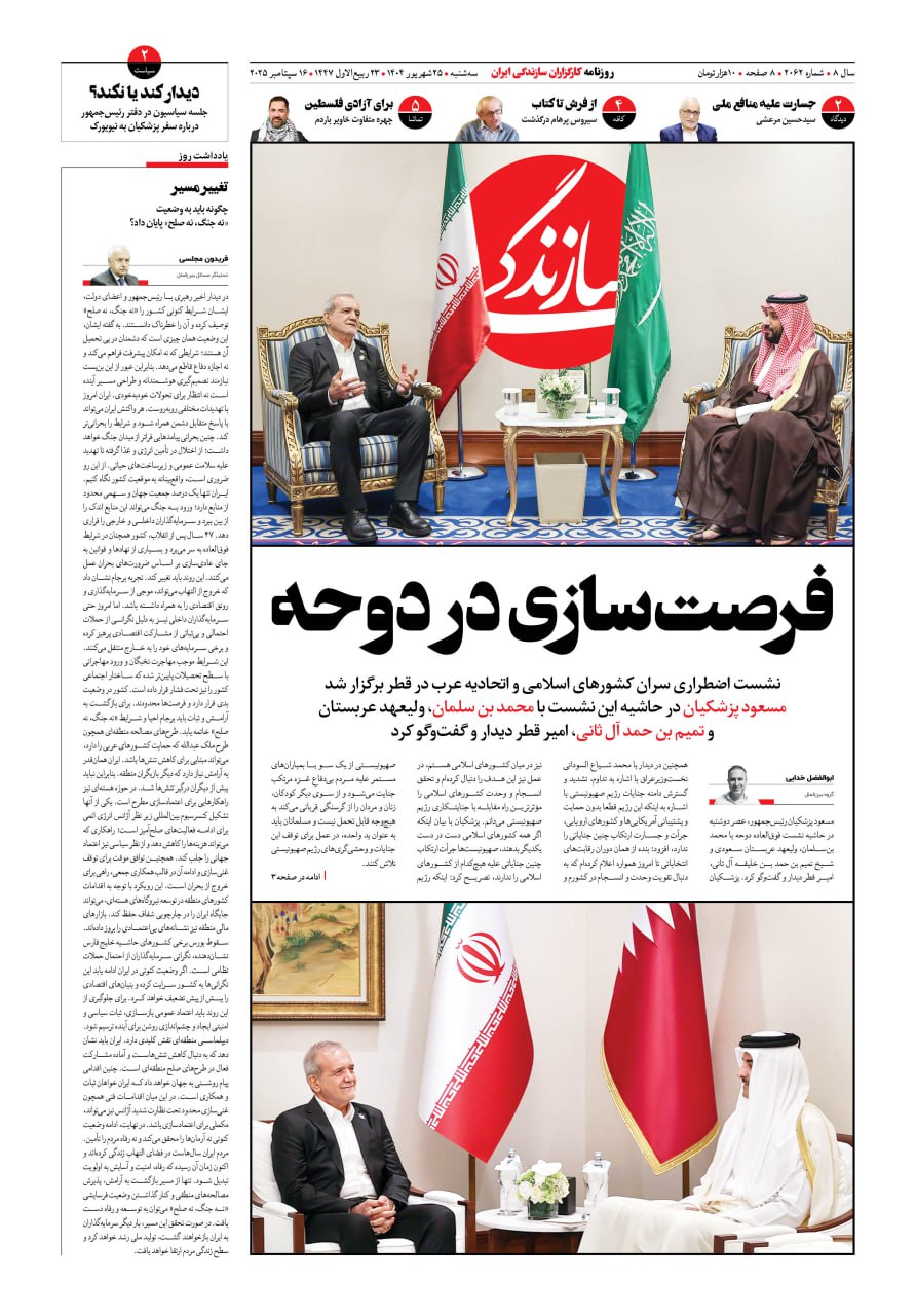 شماره ۲۰۶۲ روزنامه سازندگی سه‌شنبه ۱۴۰۴/۰۶/۲۵