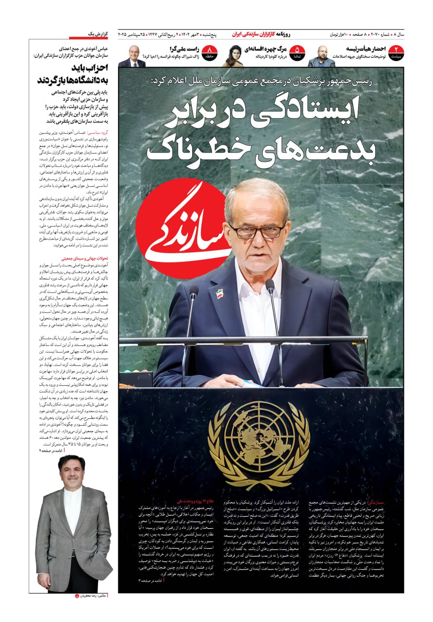 شماره ۲۰۷۰ روزنامه سازندگی پنج‌شنبه ۱۴۰۴/۰۷/۰۳