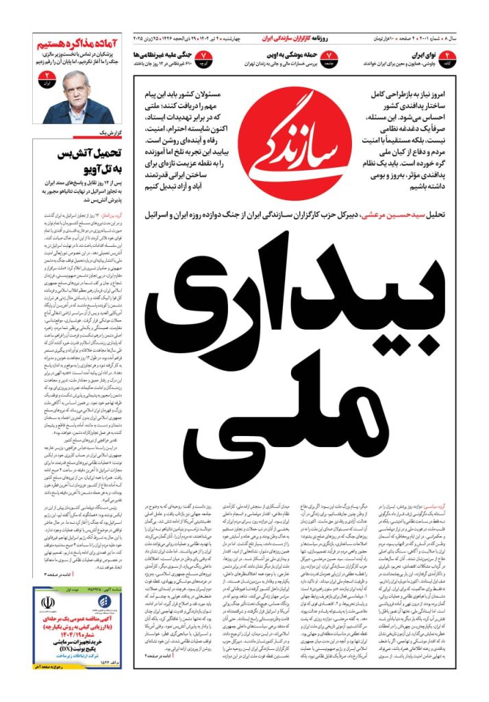 شماره ۲۰۰۸ روزنامه سازندگی پنجشنبه ۱۴۰۴/۰۴/۱۲